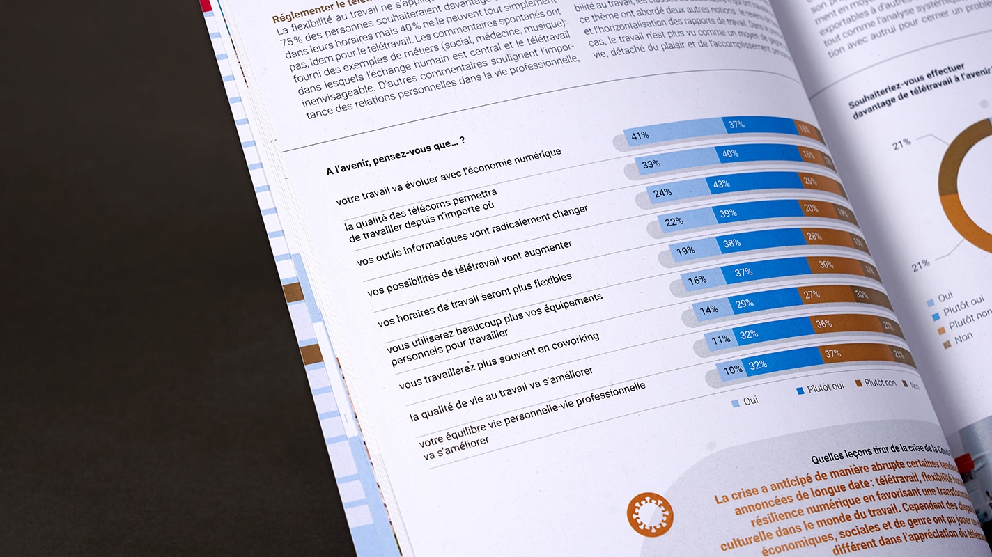 colegram décline cette identité visuelle dynamique sur l’ensemble des supports produits pour Genève Prospective. Le rapport final est proposé en versions print et digitale, adaptées à une consultation optimale sur smartphones et tablettes. Un dossier web dédié, spécialement conçu par l’agence sur la plateforme institutionnelle ge.ch, garantit un accès fluide aux résultats. Cette plateforme digitale, enrichie graphiquement par l’agence, centralise l’ensemble des ressources disponibles, renforçant l’accessibilité et facilitant la diffusion du rapport auprès de tous les publics ciblés.
